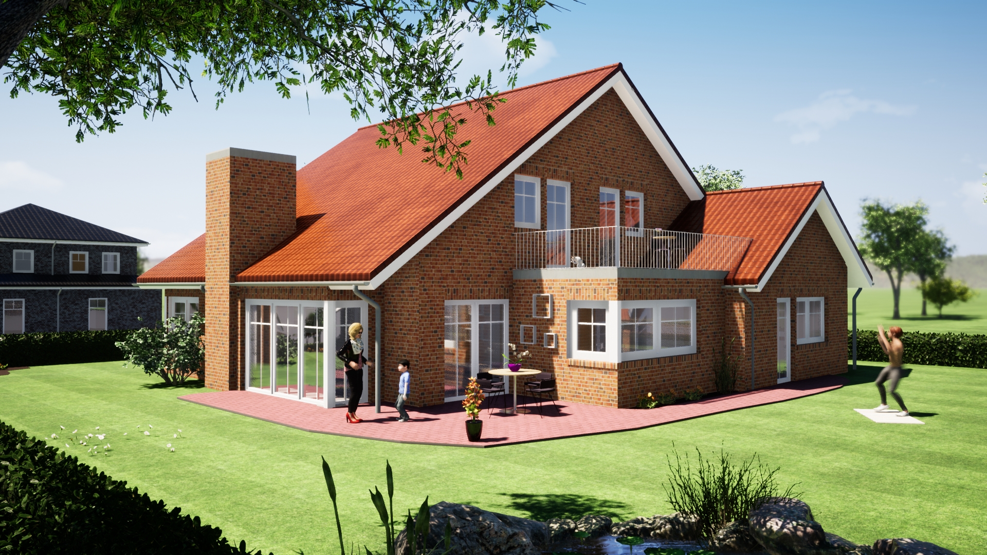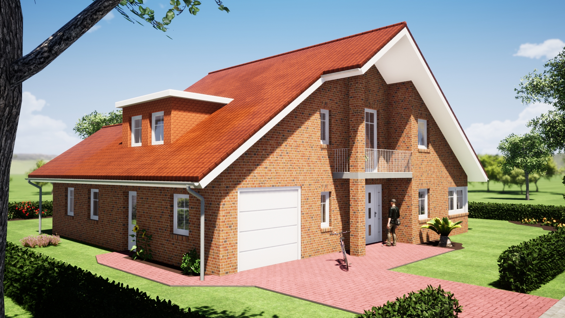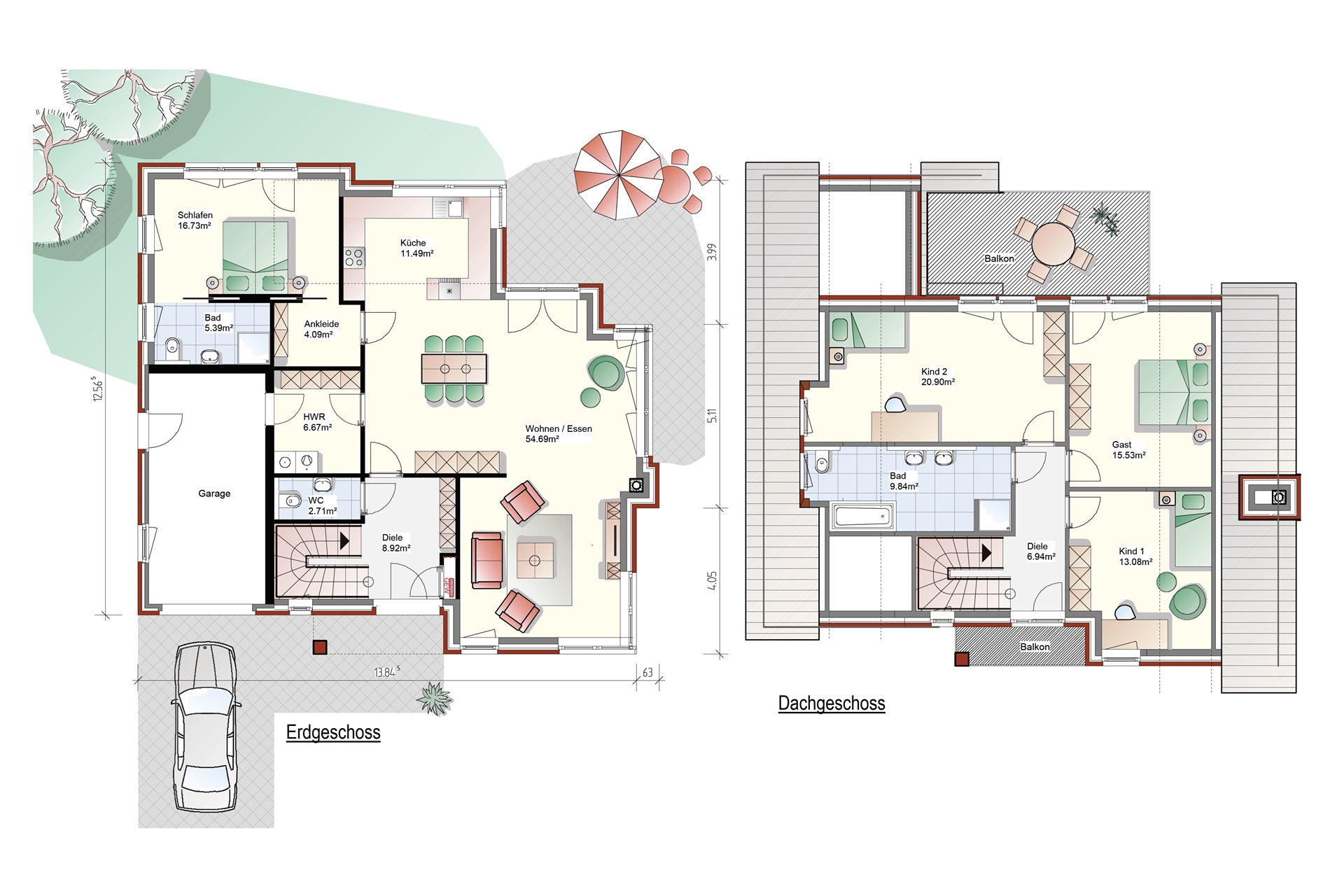 Wohnfläche: Erdgeschoss: 110.69 m² Dachgeschoss: 66.29 m² Gesamt: 176.98 m² Grundfläche: Wohnhaus: 140.71 m² Nebengebäude: 26.33 m² Gesamt: 167.04 m² Gebäudemerkmale: Satteldach mit 35° Grad Dachneigung Drempel = 12.5 cm Flachdachgaube im Dachgeschoss Balkon im Giebelbereich über der Haustür Großzügige Dachterrasse auf der Rückseite des Gebäudes Optische Besonderheit durch Eckfenster Grundriss / Typ Tolbert Haben wir Ihr Interesse geweckt? Gerne erstellen wir Ihnen ein unverbindliches Angebot. Angebot anfordern!
