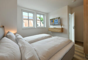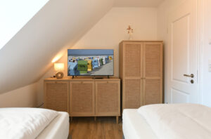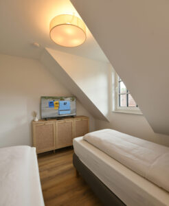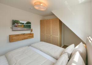 Diese 61 m² große Maisonette im "Haus Christine" bietet viel Privatsphäre, eine eigene Sauna und eine abgeschirmte Dachterrasse mit Blick ins Grüne. "Watt’n Nüst" ist der ideale Rückzugsort für alle, die Ruhe, Komfort und ein stilvolles Ambiente in abgeschiedener Lage suchen.